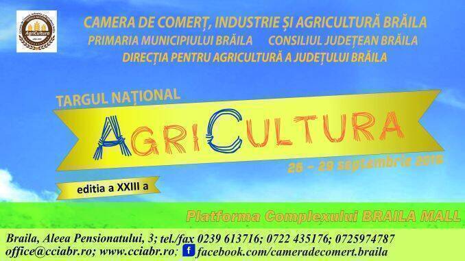 Camera Comerț, Industrie și Agricultură Brăila organizează în parteneriat cu Primăria Municipiului Brăila și Consiliul Județean Brăila cea de a 23-a ediție a Târgului Național AgriCultura. Deschiderea oficială a târgului va avea loc joi, 26 septembrie 2019, la ora 12.00.