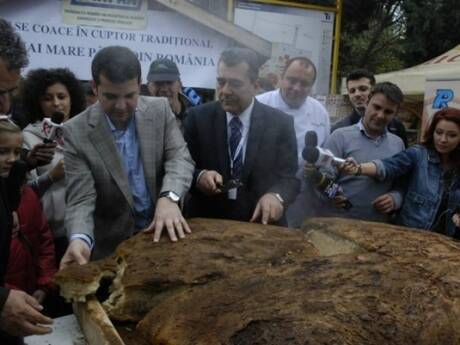 Ministrul Agriculturii, Daniel Constantin, a împărțit vizitatorilor de la târgul Indagra „cea mai mare pâine fabricată în România”, în greutate de aproximativ 96,6 kg, în cadrul unui eveniment organizat astăzi de Patronatul Român din Industria de Morărit, Panificație și Produse Făinoase (ROMPAN).