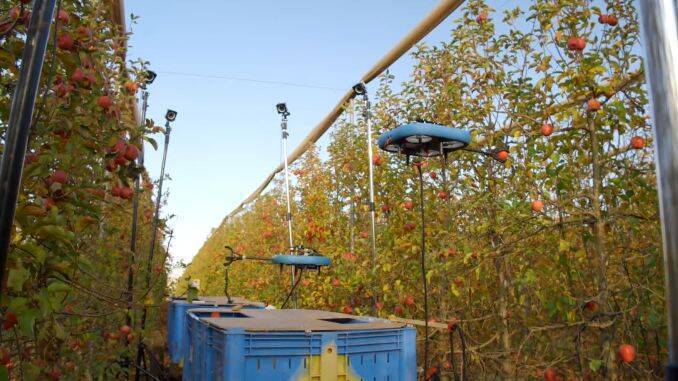 Drona folosește inteligența artificială pentru a culege fructele. Aparatul de zbor are o gheară cu o lungime de un metru, cu care apucă merele, perele sau piersicile. Drona este capabilă să recunoască fructele care nu sunt coapte și să le lase în pomi. „Creierul” care controlează toate dronele dintr-o fermă se află la sol, într-un centru mobil, scrie go4it.ro.