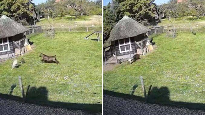 Imagini incredibile surprinse într-o fermă! O găină a fost salvată din ghearele unui șoim de prietenii cei mai buni din fermă, o capră și un cocoș.