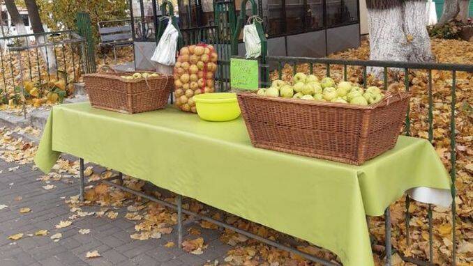 • Mere gratis în fața unei biserici. Fructele au fost donate de un fermier
