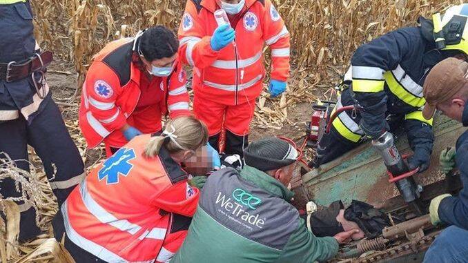 Accident la recoltarea porumbului. Echipele de intervenție au scos dintre fiarele un tânăr fermier de 26 de ani care a rămas cu piciorul blocat într-un colector de porumb.