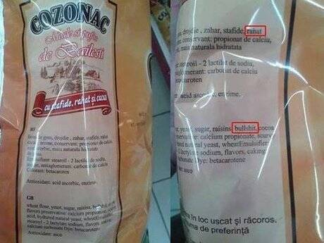 Cozonacul „moale şi pufos de Băileşti”, preparat „ca la mama acasă” cu stafide, rahat şi cacao a fost comercializat lunile trecute cu un ambalaj imprimat având explicaţii ale conţinutului alimentar atât în română,cât şi engleză. Aproape nimic în neregulă, dacă ochiul atent al unui consumator nu ar fi observat scris în engleză „bullshit” (termen din argoul englezesc folosit pentru traducerea cuvântului românesc „rahat” dar în sensul vulgar, nicidecum ca produs de cofetărie). Fotografia cu ambalajul cozonacului de Băileşti a făcut furori pe internet.