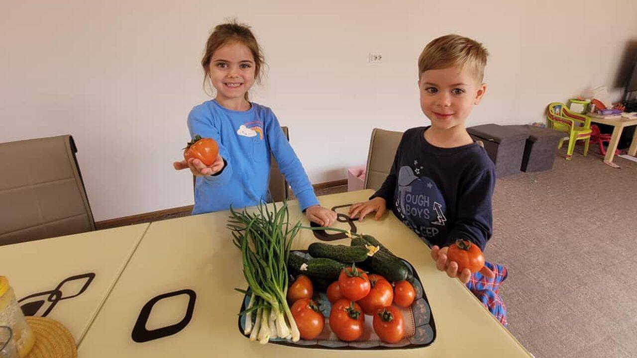 Roșii, castraveți, ceapă verde – ingredientele necesare pentru o salată sănătoasă, sunt disponibile în solarul familiei fermierului Ionuț Victor Radu din comuna Obârșia, sat Câmpu Părului din județul Olt. Primii care s-au bucurat de noua recoltă de legume românești au fost copilașii familiei, care au primit cu entuziasm ”sarcina” de a asista la prepararea primei salate cu roșii și castraveți din recolta anului 2022.