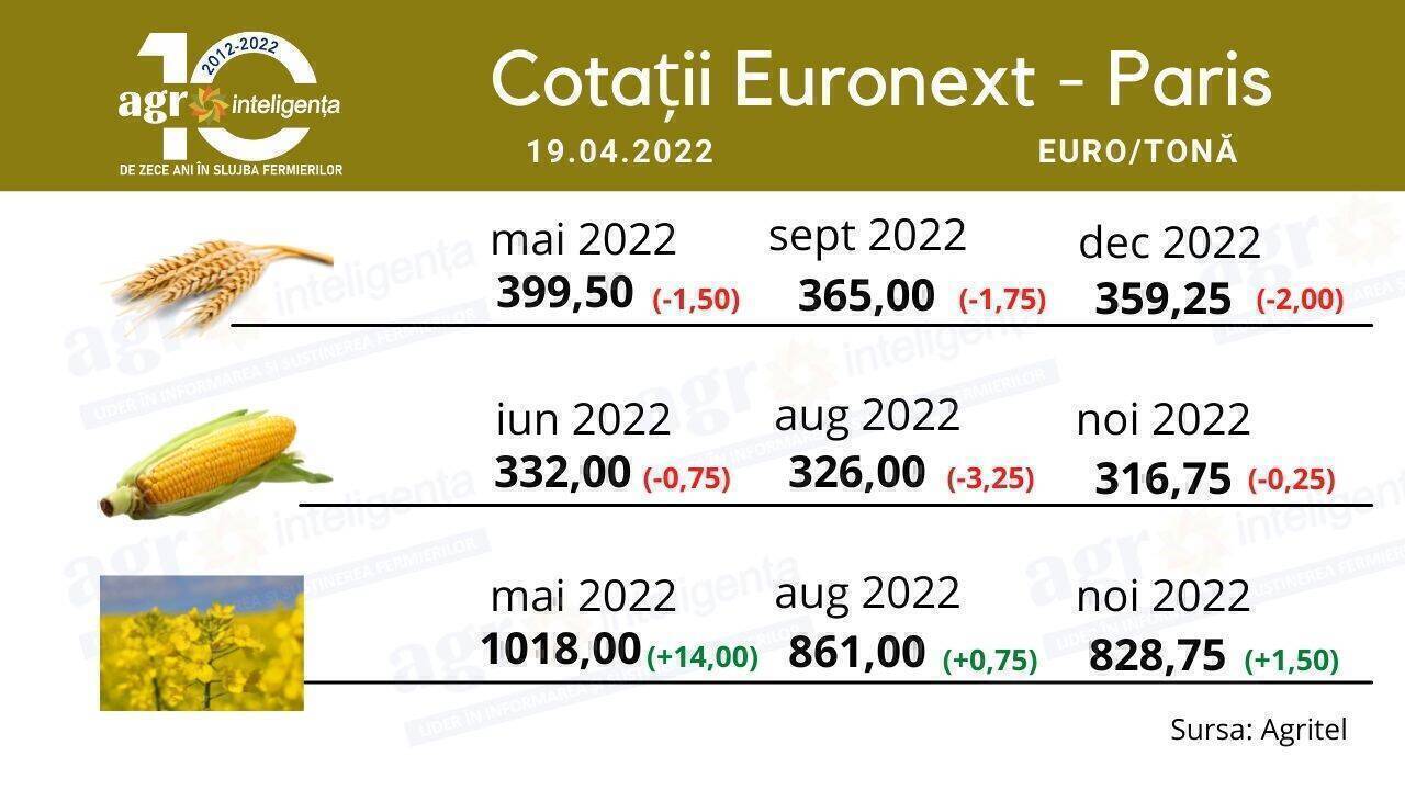 Cotațiile de ieri, 19 aprilie, s-au încheiat în principal cu o creștere a prețurilor. Rapița pe MATIF a crescut cu 1,4 la sută.