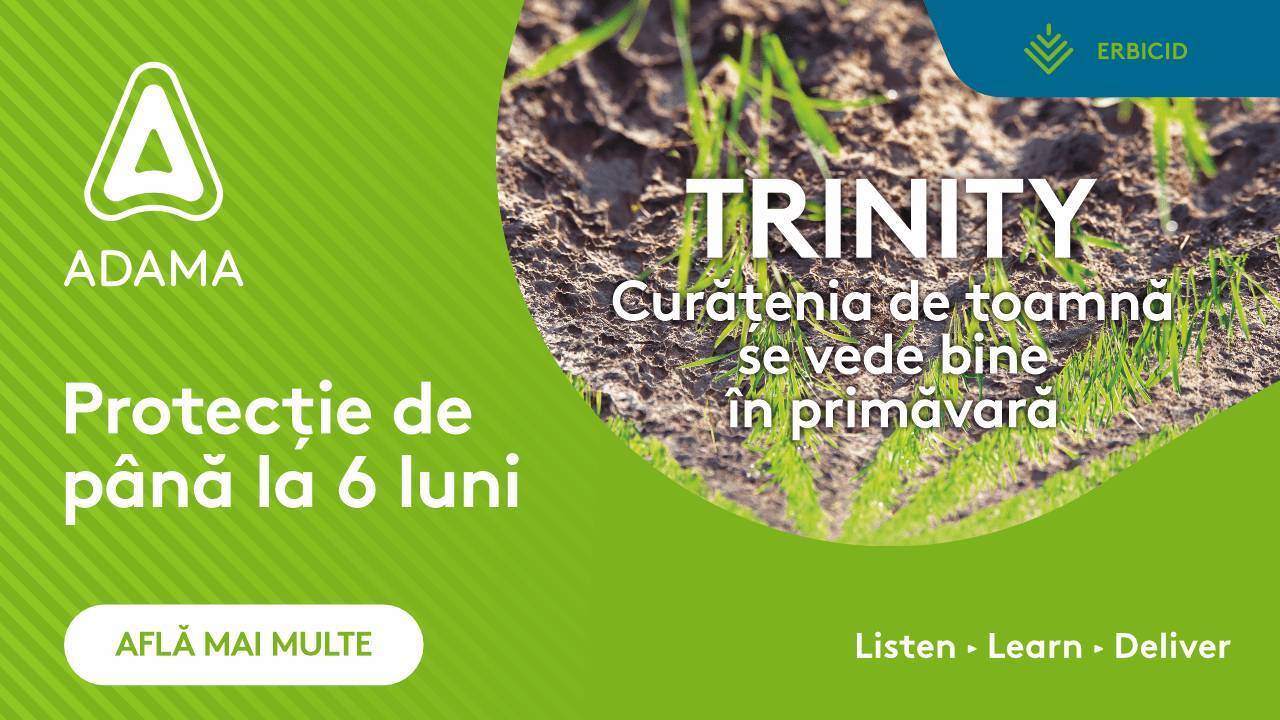 Erbicidul pe care Cosmin Micu mizează deja de ani de zile este TRINITY, din portofoliul Adama. Preferința fermierului din Arad pentru acest produs este generată de eficiența ridicată și remanența care acționează chiar și la 4-5 luni de la aplicare.