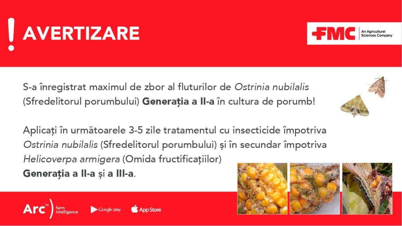 Prin urmare, vă informăm că, în urma activității de monitorizare a dăunătorilor Ostrinia nubilalis și Helicoverpa armigera din cultura de porumb desfășurată în cadrul programului Arc™ farm intelligence: