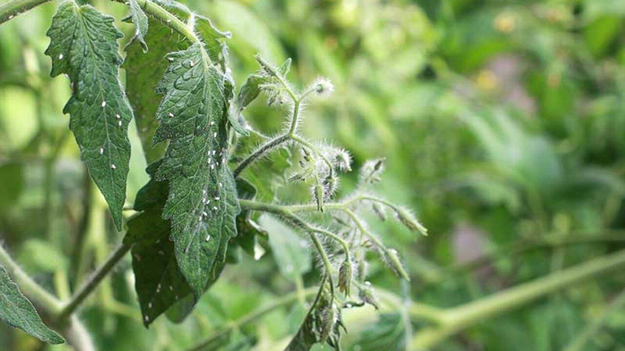 Musculiță albă pe frunza unei plante de tomate