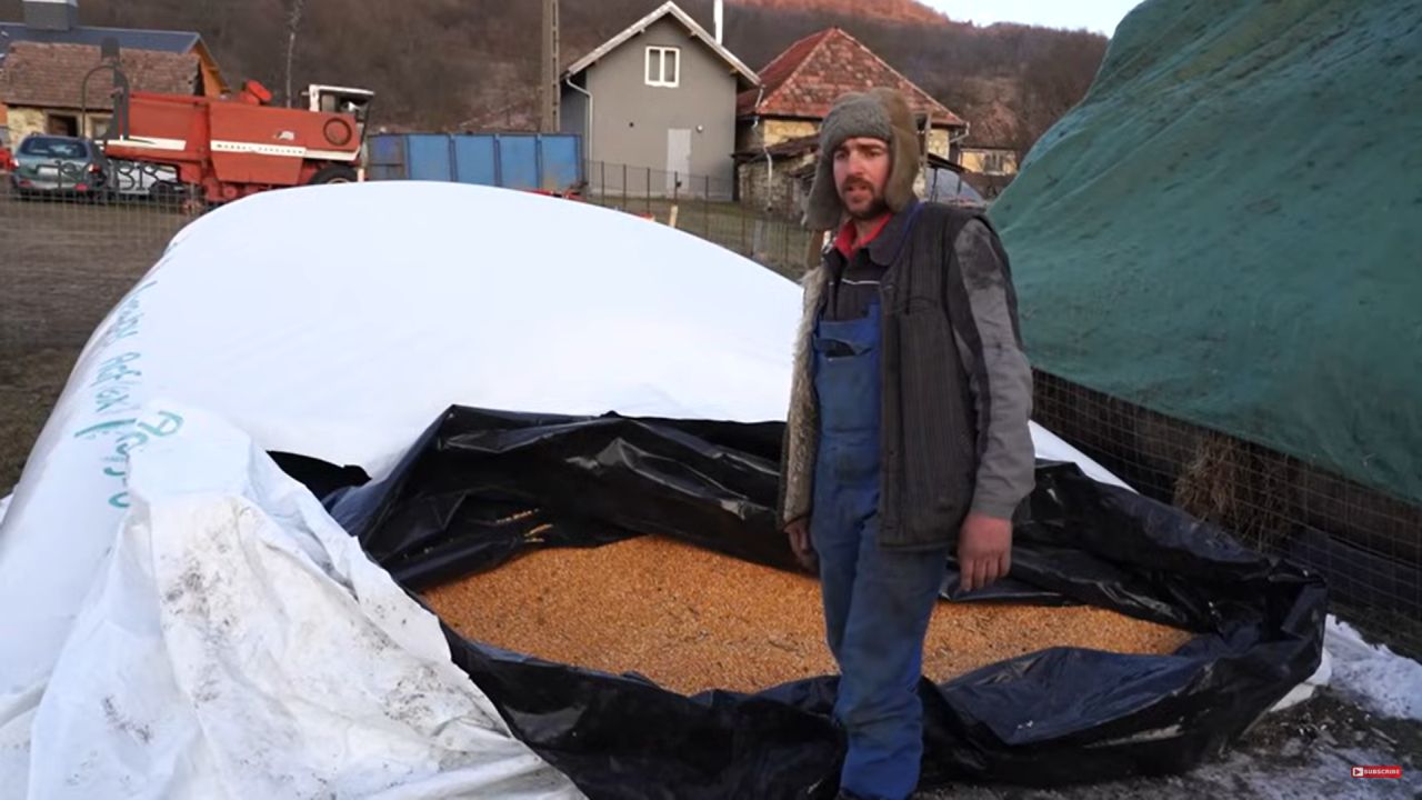 ”Uitați cum se depozitează mălaiul mai nou. Prima dată am depozitat și noi aici și uitați cum este: este ce trebuie, e uscat. Am luat un aparat în chirie, eu cu Răducu, și l-am făcut. Normal într-un sac din ăsta de 60 de metri lungime intră 200 de tone de mălai (n.r. porumb), atât putem pune în el. Din păcate n-a fost chiar așa să umplem sacul amandoi, el a avut aproape 100 de tone și eu mai puțin o țâră. Am avut mai puțin semănat, n-a fost anul mai potrivit, asta este viața. Am vrut să vă prezint numai treaba asta, l-am recoltat, l-am băgat, aparatul acela este după tractor. Este un aparat, se închiriază și asta e treaba”, a spus tânărul oier într-un video postat pe Youtube.