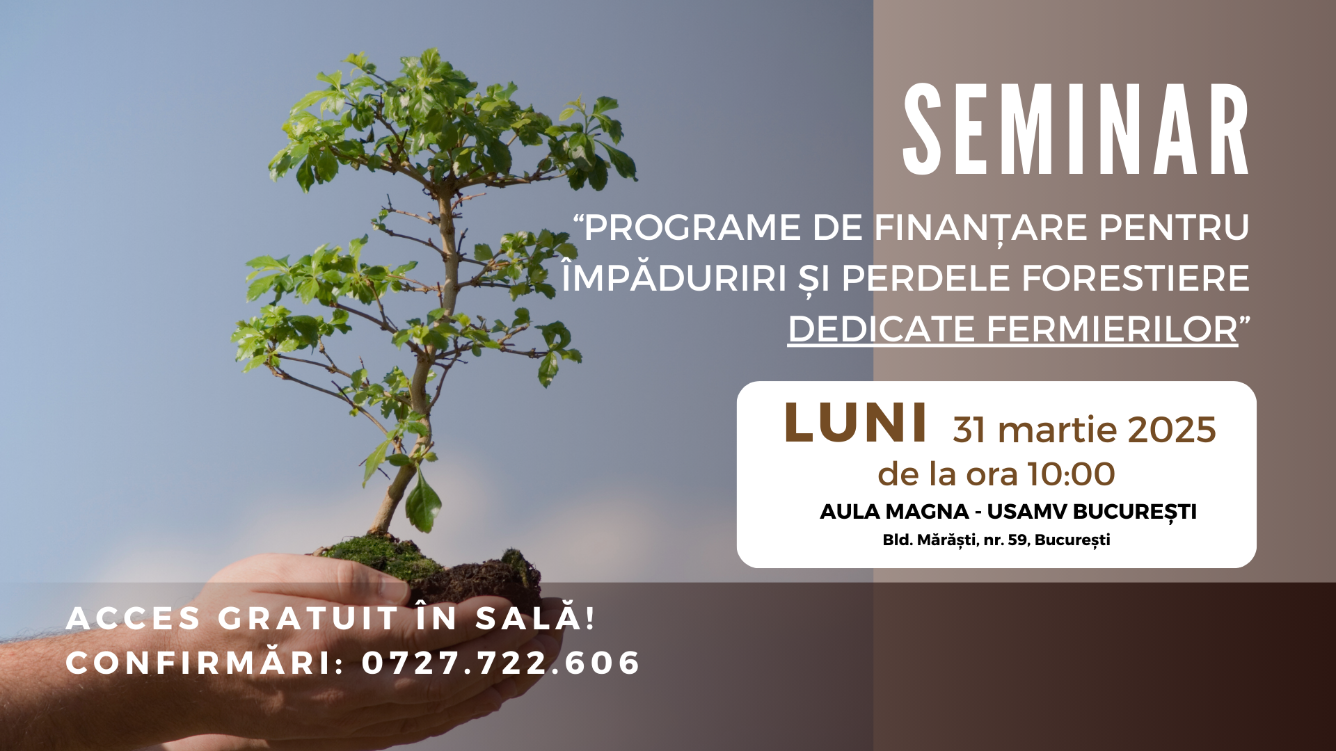 Conferința “Programe de finanțare pentru împăduriri și perdele forestiere dedicate fermierilor” este organizată în parteneriat cu Facultatea de Management și Dezvoltare Rurală din cadrul USAMV București.