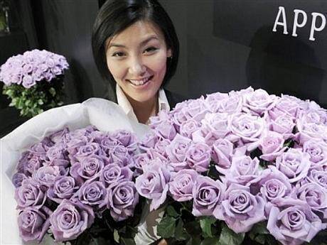 Trandafirul Applause de culoare albastră este rezultatul a 13 ani de cercetare a companiei australiene Florigene şi a companiei japoneze Suntory. În mod natural, rozele nu pot produce un pigment de culoare albastră, aşa că cercetătorii au introdus în floare gena care codifică pigmentul de culoare albastră la panseluţă, şi au blocat gena care codifică pigmentul natural al trandafirului. Rezultatul a fost un trandafir de o culoare albastru-violet, care a devenit în scurt timp foarte popular în Japonia.