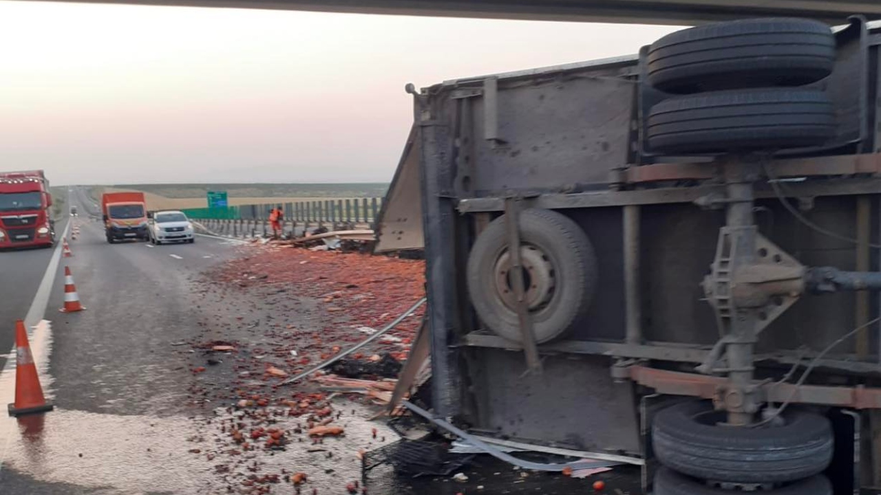 Circulația a fost restricționată, joi dimineața, pe autostrada A1, în județul Timiș, după ce o dubă plină cu fructe s-a răsturnat, iar șoseaua a fost acoperită cu cireșe, caise și piersici.