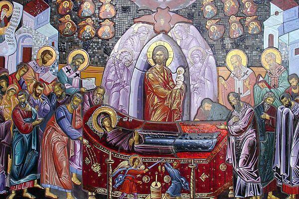 Sfânta Maria a fost înştiinţată de Arhanghelul Gavriil de trecerea ei la cele veşnice, iar ea s-a bucurat şi s-a rugat pe Muntele Măslinilor şi copacii s-au aplecat în faţa ei. Sărbătoarea ortodoxă a Adormirii Maicii Domnului este foarte apropiată de ceea ce romano-catolicii numesc Înălţarea Fecioarei. După Sfânta Tradiţie, Maica Domnului a murit ca orice fiinţă omenească, „adormind”, aşa cum indică şi numele sărbătorii.