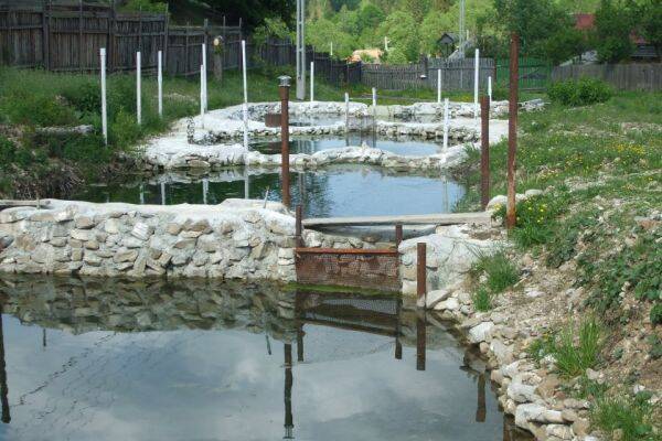 Bazinele în care cresc păstrăvi nu sunt betonate, ci sunt zidite cu piatră de râu, în așa fel încât peștele crește într-un mediu cât mai natural.