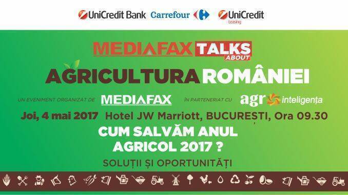 ”Cum salvăm anul agricol 2017?”, face parte din seria de conferințe Mediafax Talks, și va avea loc joi, 4 mai 2017, la hotel JW Mariott, începând cu ora 9.30. Conferința are ca parteneri media Ziarul Financiar, Gândul și Business Magazin. Evenimentul va fi transmis live pe www.agrointel.ro și pe pagina de Facebook Agrointeligența.